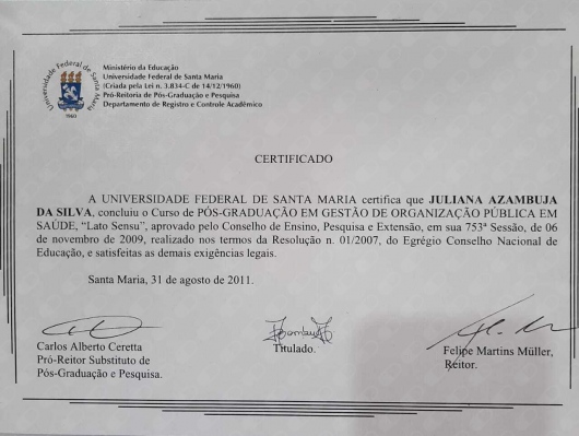 - UFSM - 2011; Especialização em Gestão de organização Pública em Saúde