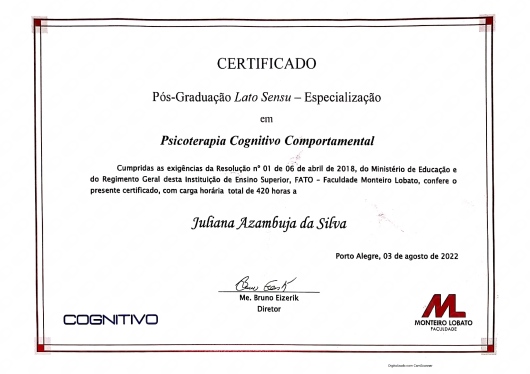 - Cognitivo- 2021; Especialização em Terapia Cognitivo Comportamental.